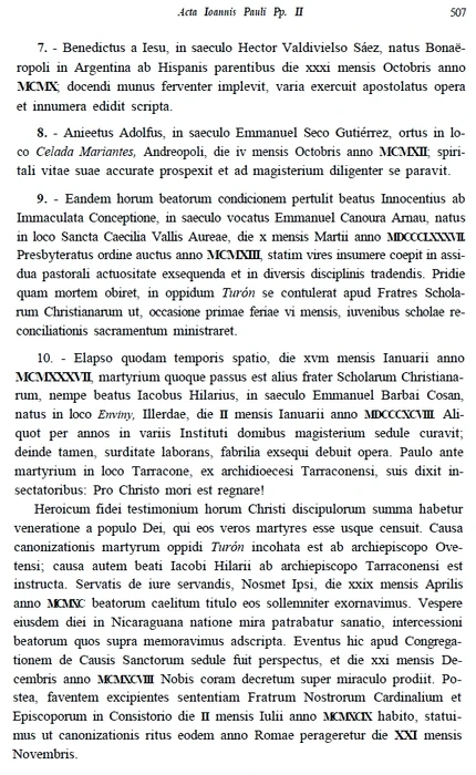 Cirilo Bertrán y 7 compañeros, Hermanos de la Doctrina Cristiana (La Salle) de Turón, más Inocencio de la Inmaculada, pasionista, capellán de la escuela, beatificados el 29 de abril de 1990. Homilía de Juan Pablo II en la ceremonia de beatificación en AAS, 1990, p. 1382-1386: