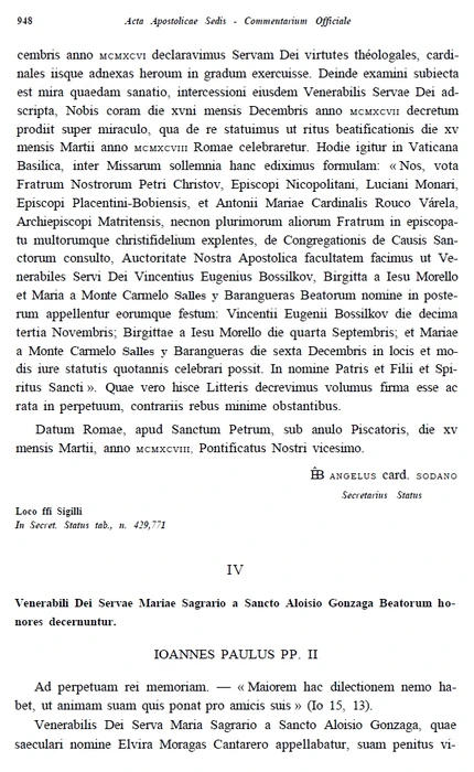 Decreto de beatificación Maiorem hac, de la misma fecha, publicado en AAS volumen y año 90 (1998), p. 948-950: